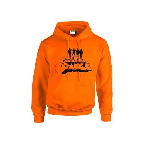 Een zeer opvallende Clockwork Orange hoodie in de kleur Safety Orange. Deze hoodie heeft een kwaliteit van 50% katoen 50% polyester.  Heeft ruime buidelzakken en een warme capuchon met mee gekleurde koorden. Deze bedrukte hoodie is afgewerkt met een dubbeldraads gestikte detaillering en heeft een elastische en geribbelde zoom en manchetten. U kunt kiezen of u de print op de voorkant of achterkant bedrukt wilt hebben.