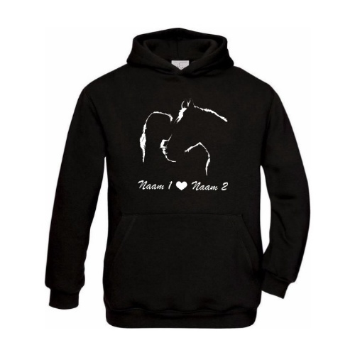 Een superleuke print van een meisje met haar paard bedrukt op een zwarte hoodie. Je kan zelf de naam van het meisje en van het paard opgeven die wij dan voor je bedrukken op een zwarte hoodie. De hoodie heeft een kwaliteit van 50% katoen en 50% polyester. Heeft ruime buidelzakken en een warme capuchon met trekkoorden. De kleinere maten ( 3/4 - 5/6 - 7/8 - 9/11 en 12/13 jaar )  hebben geen trekkoorden i.v.m verstikkingsgevaar.