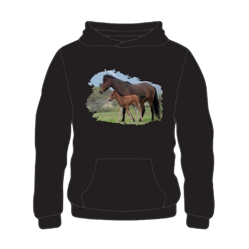 Een leuke print van een paard met veulen die wij voor je bedrukken op een hoodie. De hoodie heeft een kwaliteit van 50% katoen - 50% polyester en heeft ruime kangoeroezakken en een warme capuchon met trekkoorden.