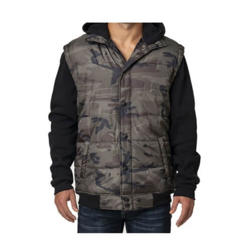 Een camouflage bodywarmer en fleece hooded shirt in 1. Heeft lange mouwen, een capuchon,steekzakken en een sluiting met drukknopen.