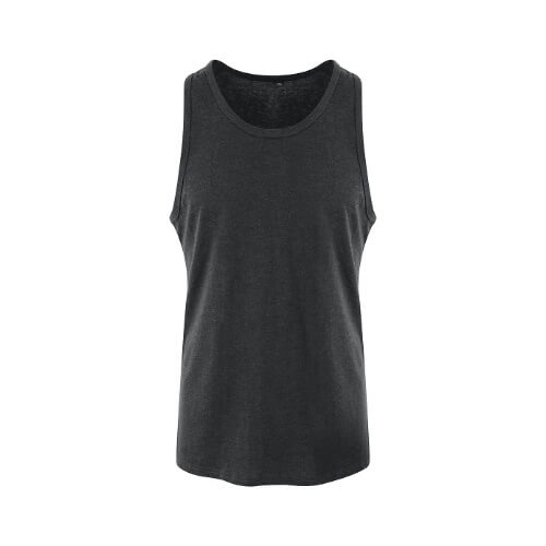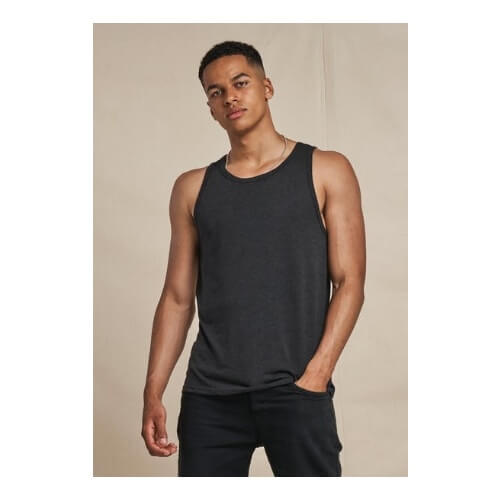 De TRI-BLEND Vest, of ook wel een singlet genoemd heeft een kwaliteit van 160gr - 50% polyester / 25% viscose / 25% katoen. De kleur Heather black 40% katoen / 40% katoen / 20% polyester. Rond de halslijn en armsgaten zit een effen band voor extra stevigheid. Alles is netjes afgewerkt met dubbel gestikte naden. Leverbaar in 4 kleuren vanaf maat S t/m XXL.