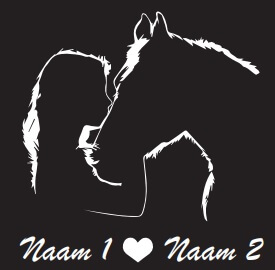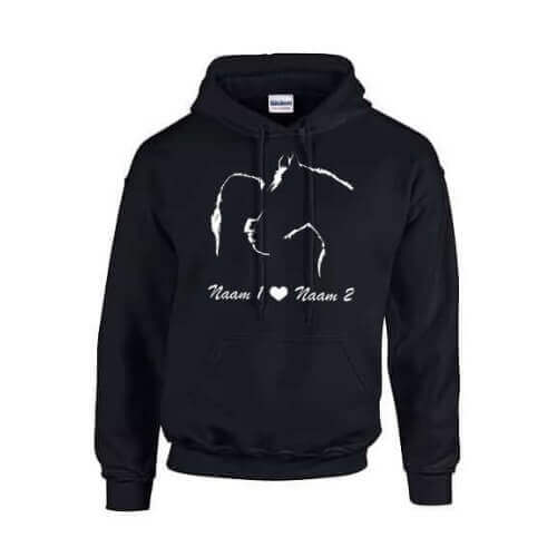 Een superleuke print van een meisje met haar paard bedrukt op een zwarte hoodie. Je kan zelf de naam van het meisje en van het paard opgeven die wij dan voor je bedrukken op een zwarte hoodie. De hoodie heeft een kwaliteit van 50% katoen en 50% polyester. Heeft ruime buidelzakken en een warme capuchon met trekkoorden. De kleinere maten ( 9/11 en 12/13 jaar )  hebben geen trekkoorden i.v.m verstikkingsgevaar.